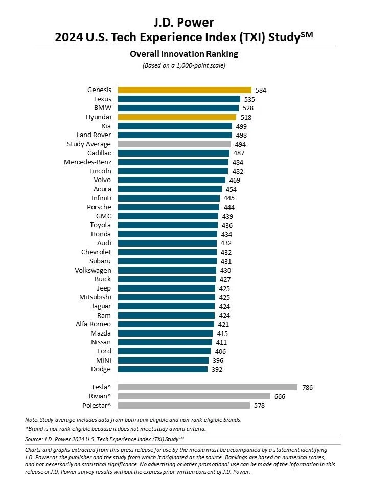 Genesis ranks highest overall and highest among premium brands for innovation for a fourth consecutive year, with a score of 584 (on a 1,000-point scale). In the premium segment, Lexus (535) ranks second and BMW (528) ranks third.