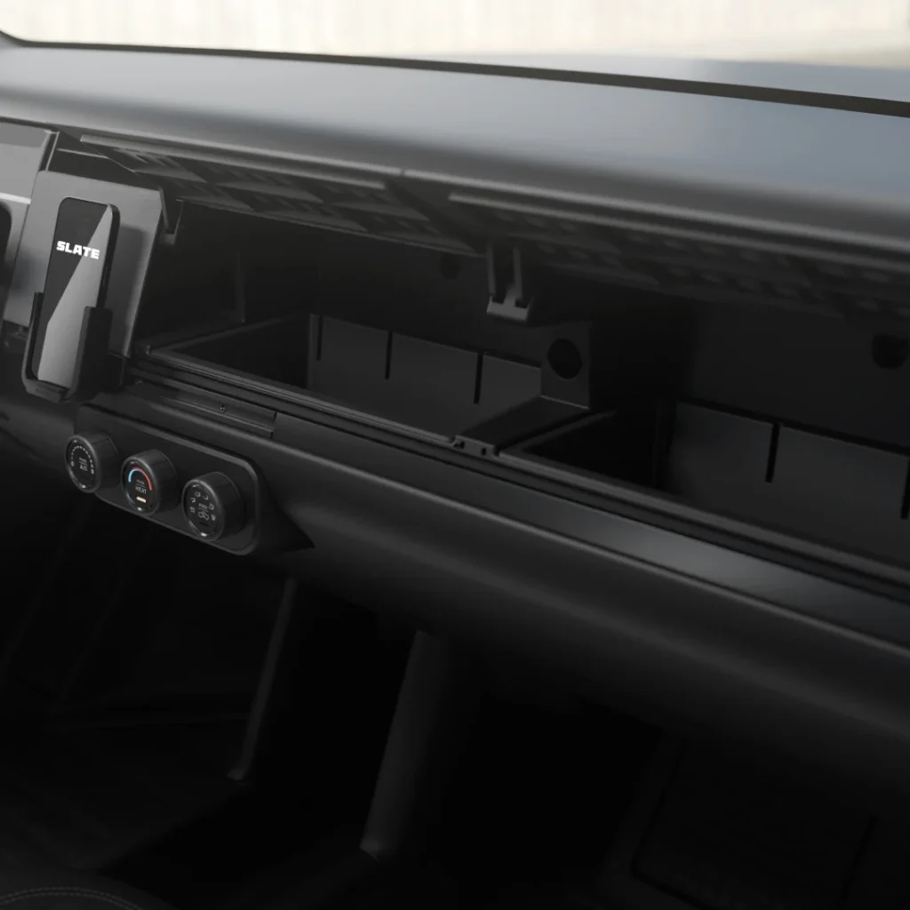 Rather than relying on a bulky, fast-aging infotainment system, the Slate Truck offers a another solution: a streamlined mount designed to hold a smartphone or tablet, paired with a dock for a portable Bluetooth speaker. Essential comforts like heating and air conditioning come standard.