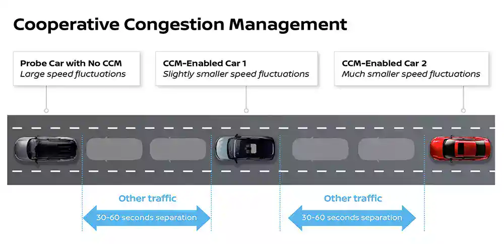 At the heart of the system is Nissan’s ProPILOT Assist technology, available on many U.S. Nissan models. ProPILOT uses cameras and radar sensors to maintain lane position and safe following distances. For the CCM trial, engineers layered new communication software on top of ProPILOT to allow the vehicles to coordinate speeds in response to real-world congestion.