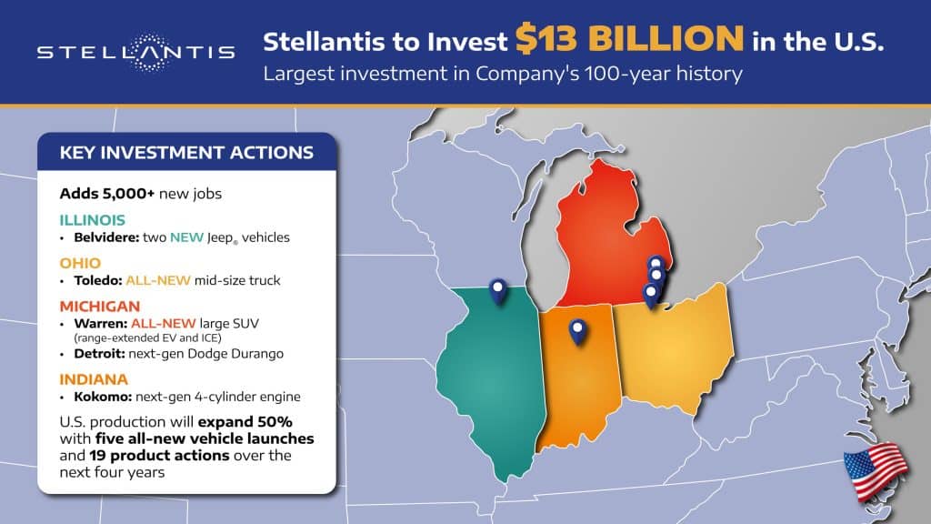 Stellantis currently operates 34 manufacturing, distribution and R&D facilities across 14 states, employing more than 48,000 workers and supporting thousands of suppliers and dealers nationwide.