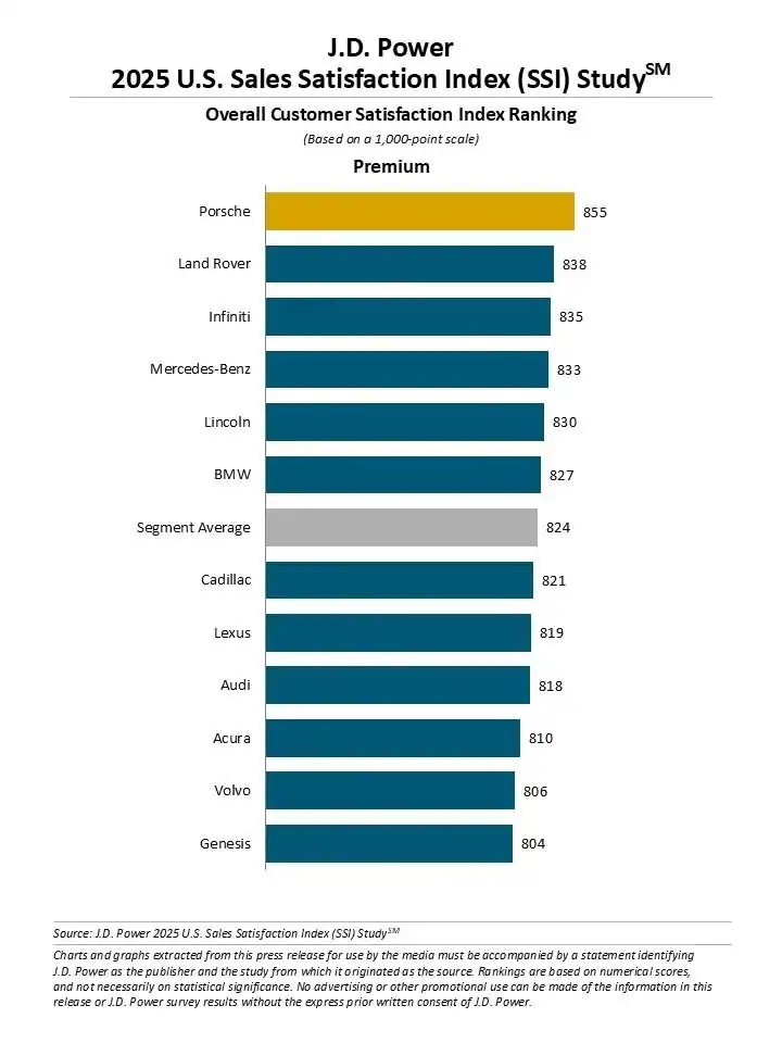 In brand rankings, Porsche once again dominated the premium category, securing the top spot for the third consecutive year with a score of 855. Land Rover followed at 838, and Infiniti ranked third at 835.