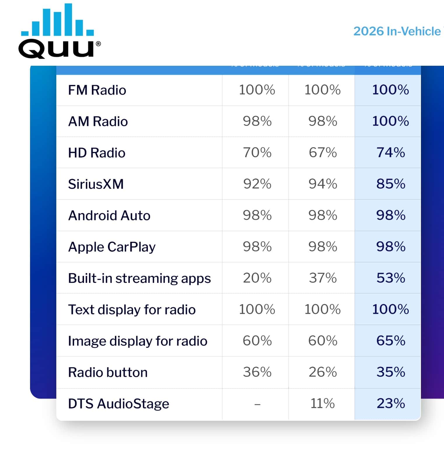 That is the central finding of Quu Inc.’s 2026 In-Vehicle Visuals Report, a third-year study that audits the dashboards of the 100 best-selling new vehicles in the United States. Released in April, the report offers the most comprehensive public accounting yet of how radio competes — or struggles to compete — for attention in the modern car.